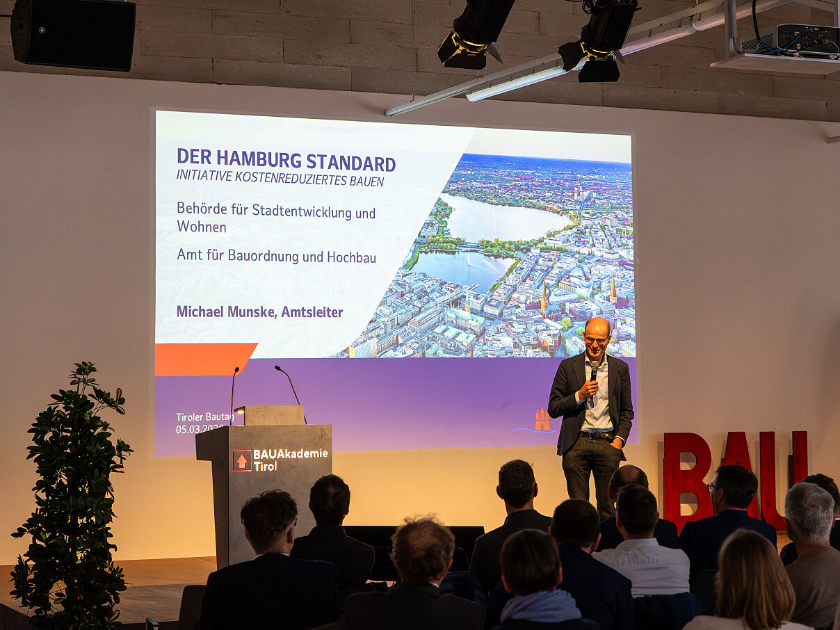 Ein zentraler Programmpunkt des Bautags war der Impulsvortrag von Michael Munske, Erster Baudirektor und Leiter des Amtes für Bauordnung und Hochbau in der Hamburger Behörde für Stadtentwicklung und Wohnen. Er stellte den sogenannten Hamburg-Standard vor, der im Rahmen der Initiative „Kostenreduziertes Bauen“ entwickelt wurde.